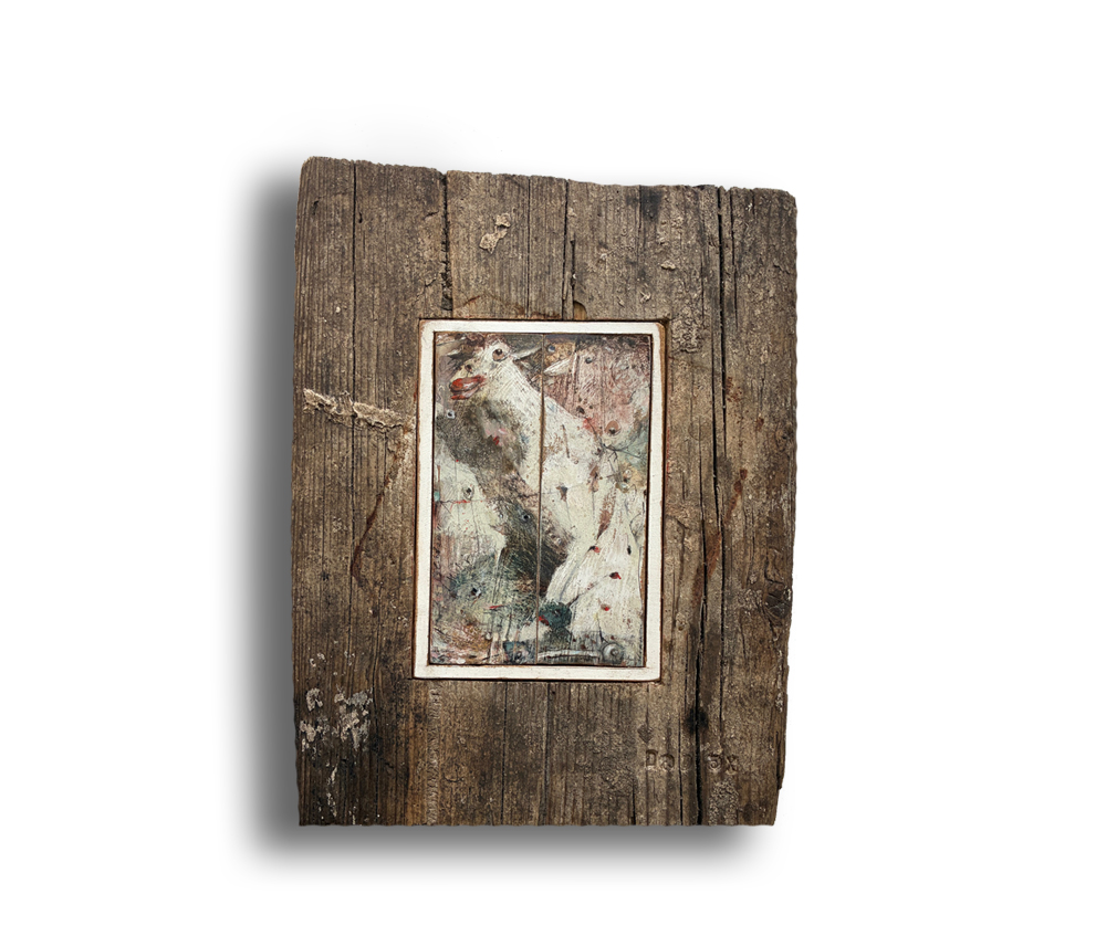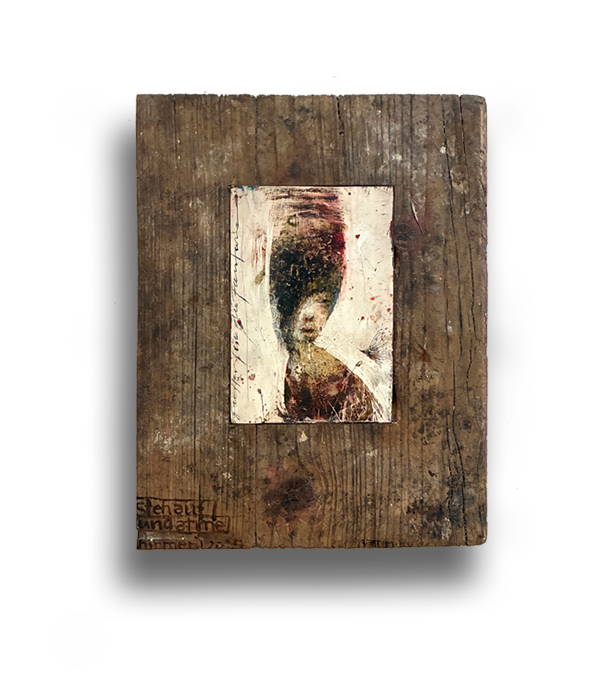 Ölfarbe auf Holzmalfläche 11x16 cm, eingepasst und verleimt im Holzblock 21x29,5 cm, Tiefe 5 cm. | 2025