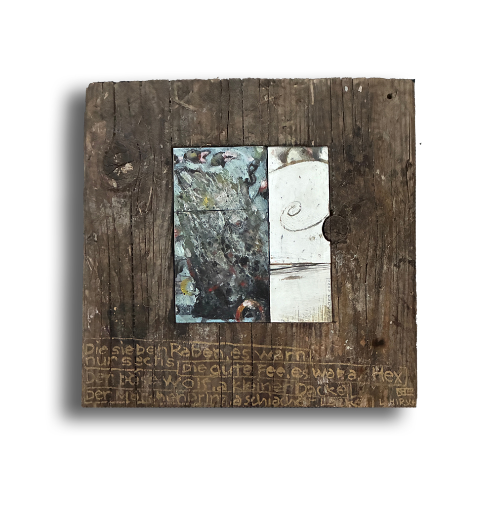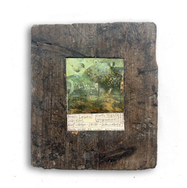 Mit dem Gedicht von M. Kaléko. Ölfarbe auf Holzmalfläche, eingepasst und verleimt im Holzblock 30 x 31 cm, Tiefe 5 cm. | 2025