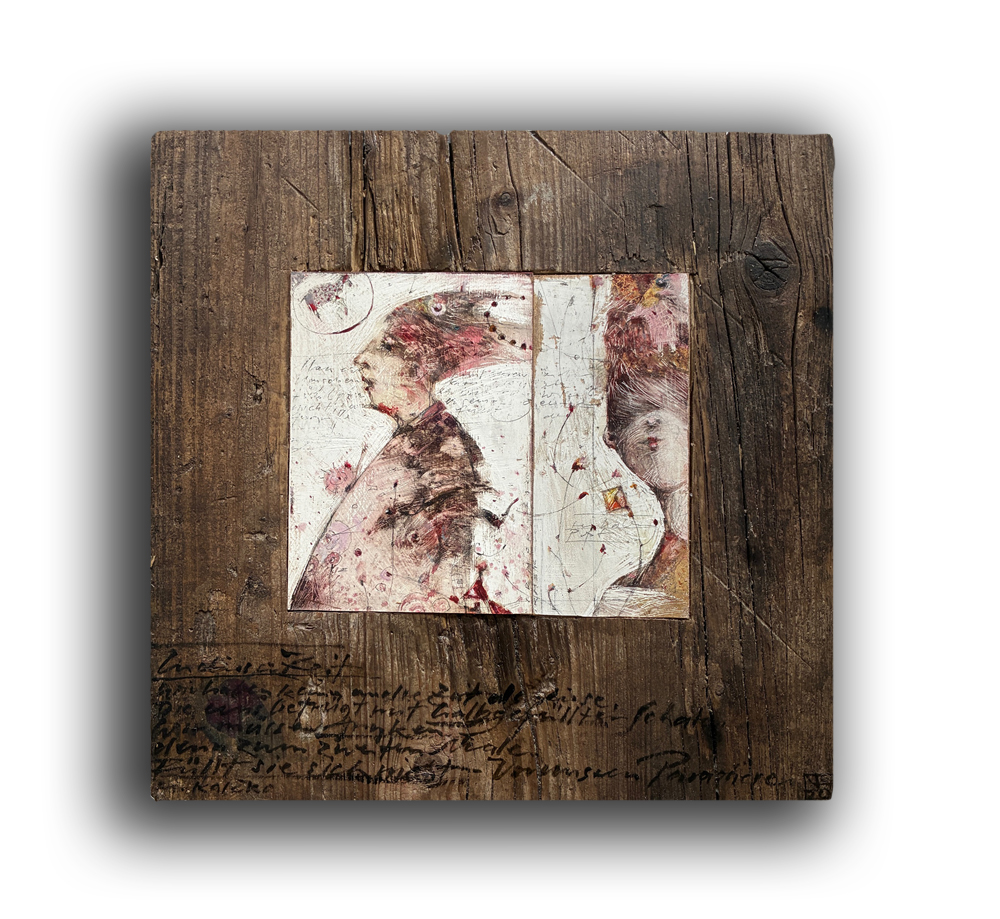 Ölfarbe auf zwei Holzmalflächen, eingepasst und im Holzblock 30,5x31,5 cm verleimt, Tiefe 5 cm. 2025