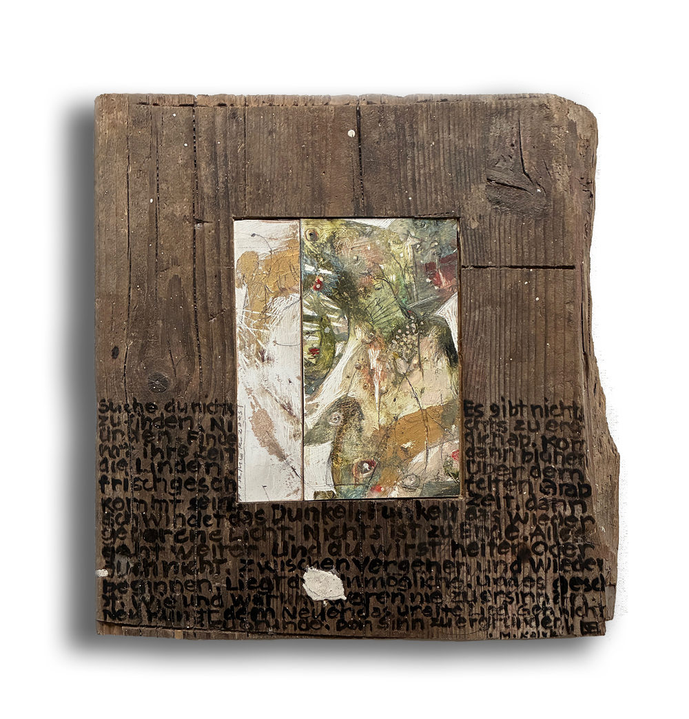Mit einem Gedicht von M. Kaléko. Ölfarbe auf Holzmalfläche, eingepasst und im Holzblock 31x30 cm verleimt, Tiefe 5 cm. | 2025