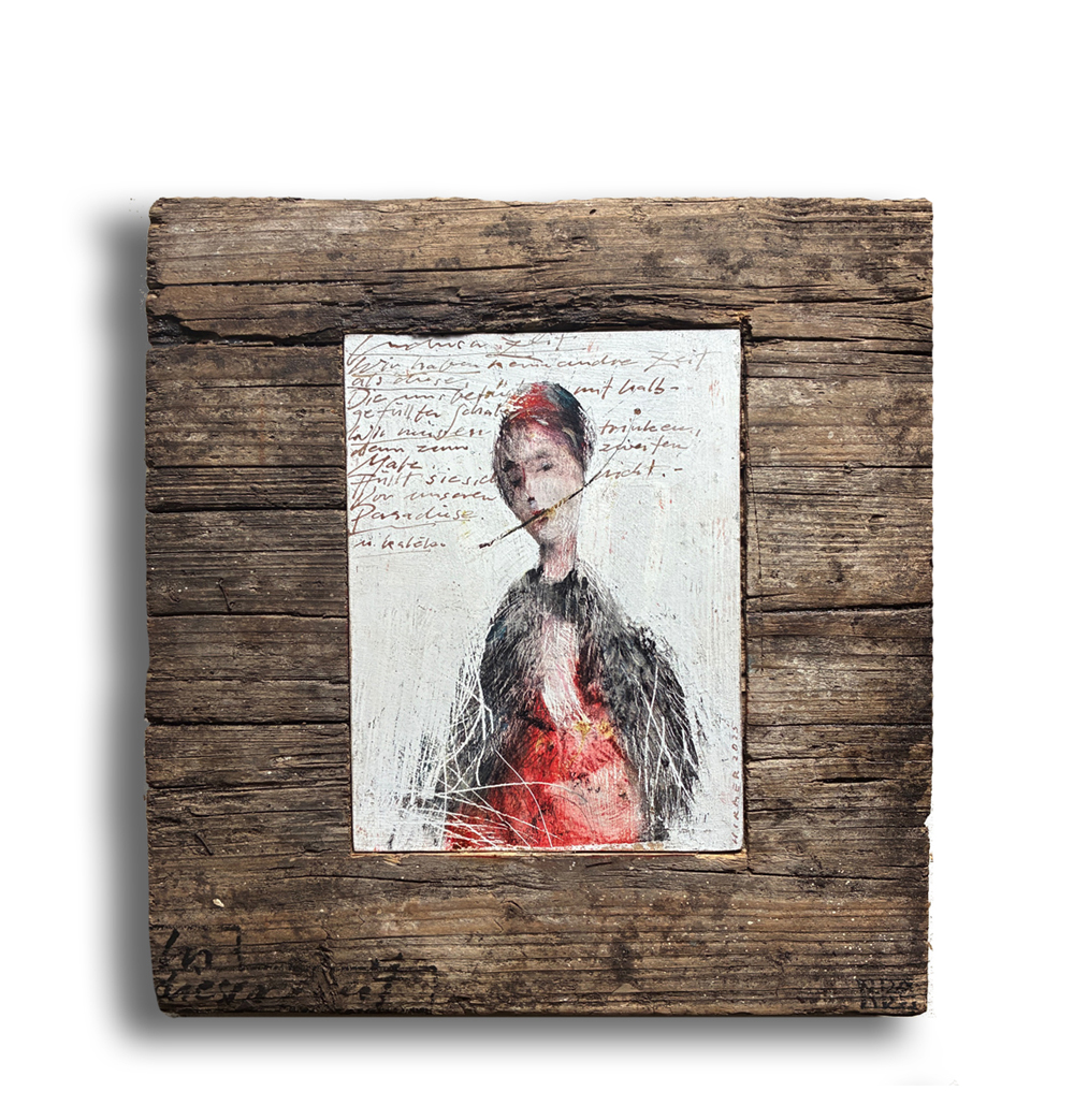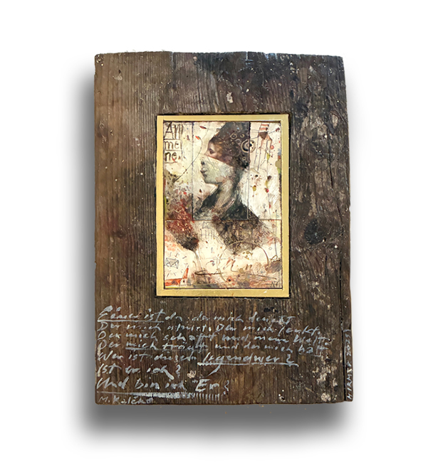 Mit einem Gedicht von M. Kaléko. Ölfarbe auf Holzmalfläche, der goldene Rahmen ist extra geschnitten, eingepasst und im Holzblock 24x30,5 cm verleimt, Tiefe 5 cm. | 2025
